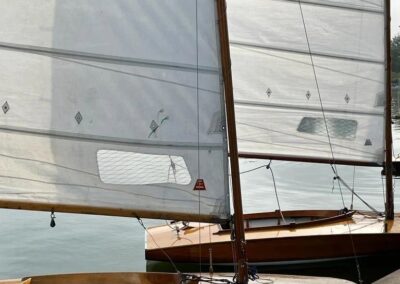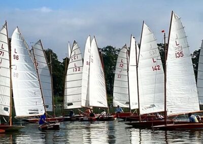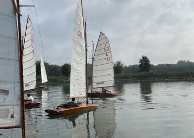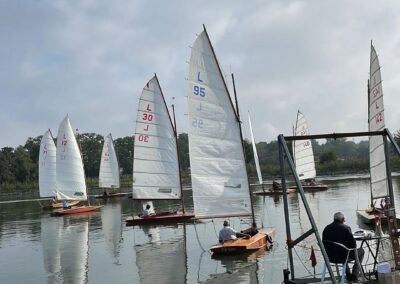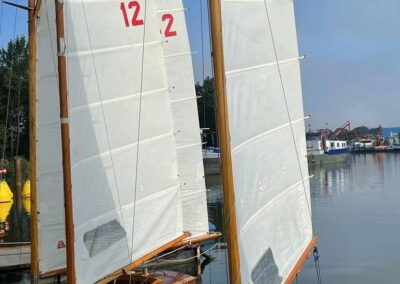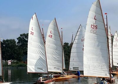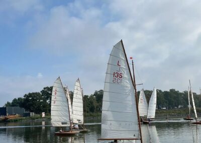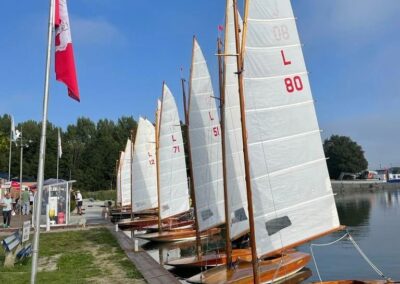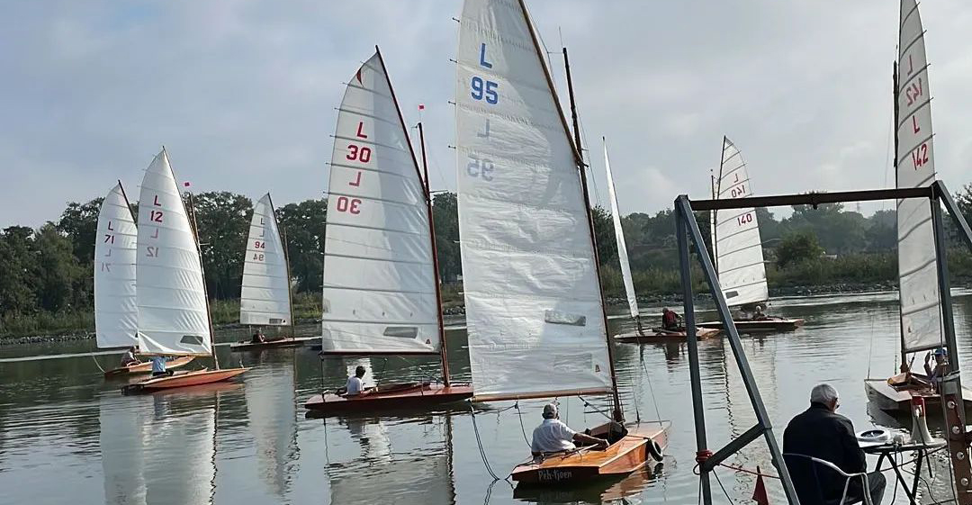 Zondag 11 september was de jaarafsluiting van de larken. De eerste boten waren er al vóór 9 uur, en dankzij Ron`s liertje verliep het takelen probleemloos. Rond 11 uur dobberden er dan ook 15 (sic!) larken in het kanaal. Ook dit jaar taart als welkom bij de koffie en we lieten ons dat goed smaken. Johan heette ons welkom en overhandigde Stef de wisselbeker van`t zeilen in Eastermar. Daar de windgoden wat anders te doen hadden, lagen alleen boei 1 en 2 in het water. Sjoerd voer in de L49 van Ron. Sytse gaf het roer van de L30 aan Janwigle, Jetze en Gerrit en die zeilden de boot naar de 12e plaats. Arjan en Harry zeilden samen de L142. Bert nam plaats op het startvlot, gaf een tien-minuten-signaal, en 5 minuten later was de eerste rij van 5 lichten te zien. Rond de startlijn was het zo vol, dat pas de 3e start goedgekeurd werd. Er was voldoende wind om rustig beide boeien te ronden, maar te weinig om voor de lunch een 2e heat te varen. Na de middag was er iets meer wind en konden er twee heats, na elkaar, gevaren worden. Bij het ronden van boei 1 lagen alle larken min-of-meer op en over elkaar, vingen het laatste beetje wind weg, zodat wegvaren van de boei ná het ronden, meer op achteruit varen leek. Nadat de laatste boot door de finish ging, klonk het 10-minuten-sein voor de 3e en laatste heat. De wind woei, helaas, steeds uit een andere richting, zodat vaantje-kijken een “must” was. De rescue-boot, met Ron aan het roer, had weinig te doen, zodat hij bij de laatste heat de 2e boei maar een stukje dichterbij legde. De larken werden uit het water en op de trailers getakeld – altijd een enerverende gebeurtenis. Bert had de punten verzameld en opgeteld, en Stef reikte de prijzen uit. De 3e plaats was – geheel onverwachts – voor de L1 van Mijndert. De 2e plaats voor de L95 van Jan Elzenga en de winnaar was de L12 van Bennie, bij elkaar gezeild. De aanmoedigingsprijs voor de “best-of-the-rest” ging naar de L94 van Willemien. Met dank aan Stef voor de gezellige prijsuitreiking. Kok Hennie had inmiddels de bestellingen opgenomen en rond vijf uur konden aan tafel voor het welverdiende zeilers-eten. De volgende wedstrijd in Almelo (vast met meer wind): zondag 10 september 2023.